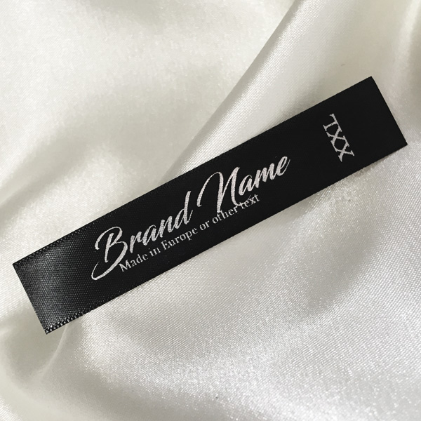 Gepersonaliseerd label TL-M21 gedrukt op satijnen stof. Geschikt voor kleding, kledingaccessoires en andere textielproducten.