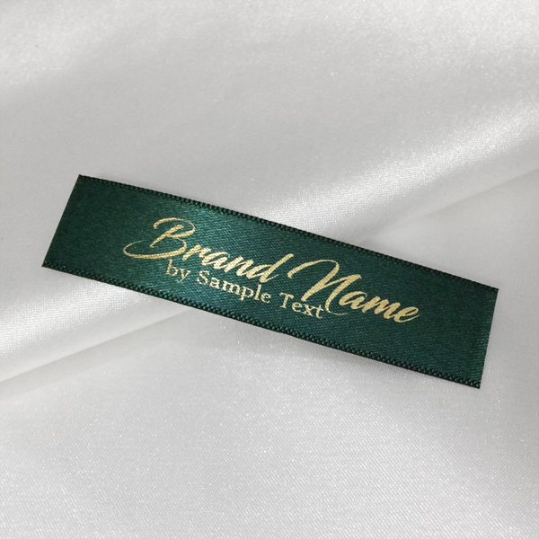 Textiellabel bedrukt met aangepaste teksten op satijnen stof, gesneden volgens de gepresenteerde afmetingen.