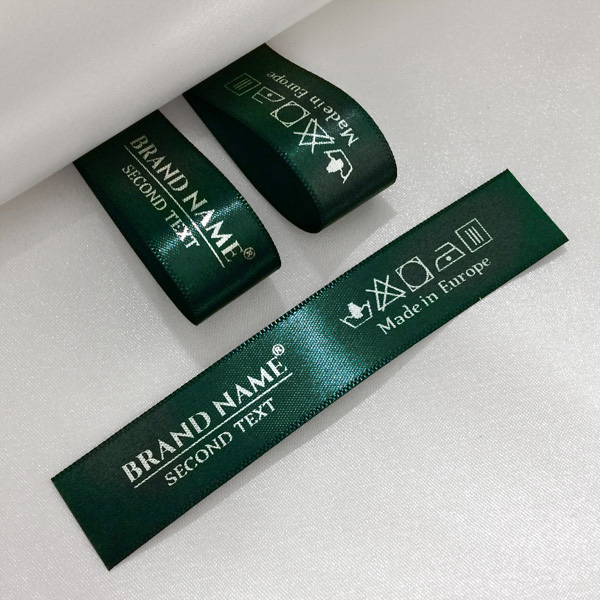 Gepersonaliseerd label TL-M91 gedrukt op satijnen stof. Geschikt voor kleding, kledingaccessoires en andere textielproducten.