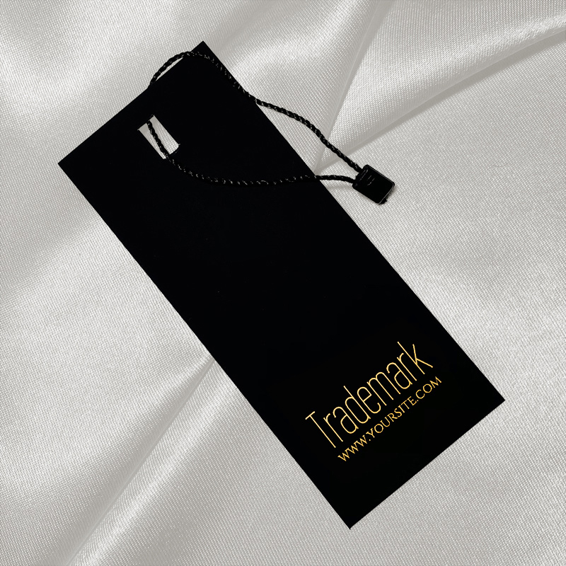 Kartonnen label voor kleding, inclusief sluiting met een polyester koord voor bevestiging van het HT-M108 model, gemaakt van dik, zwart karton en gepersonaliseerd met gouden tekst of een logo. Dit type hang tag wordt gemaakt van hoogwaardige materialen. Daarbij wordt gebruik gemaakt van de meest geavanceerde technologieën op het gebied van digitaal printen en afwerken.