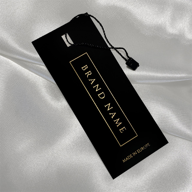 Kartonnen hang tag met gouden letters en een zwarte achtergrond. De hang tags zijn voorzien van een koord en gemaakt van Soft Touch karton. Beide zijden zijn gelamineerd. Dit type hang tag wordt gemaakt van hoogwaardige materialen. Daarbij wordt gebruik gemaakt van de meest geavanceerde technologieën op het gebied van digitaal printen en afwerken.