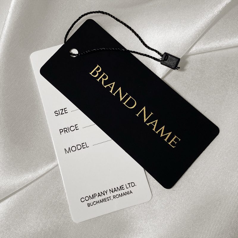 Set van 2 kartonnen labels voorzien van een zegel met een ophangkoordje voor kleding of kledingaccessoires, gemaakt van dik geplastificeerd karton en bedrukt met goud en zwarte tekst. Dit type hang tag wordt gemaakt van hoogwaardige materialen. Daarbij wordt gebruik gemaakt van de meest geavanceerde technologieën op het gebied van digitaal printen en afwerken.