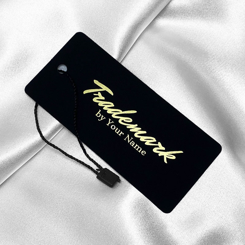 Label om aan kleding van het tagtype te hangen, op bestelling gemaakt van zwart karton met tekst of gepersonaliseerd logo, bedrukt door thermische transfer met Gouden Folio. Dit type hang tag wordt gemaakt van hoogwaardige materialen. Daarbij wordt gebruik gemaakt van de meest geavanceerde technologieën op het gebied van digitaal printen en afwerken.