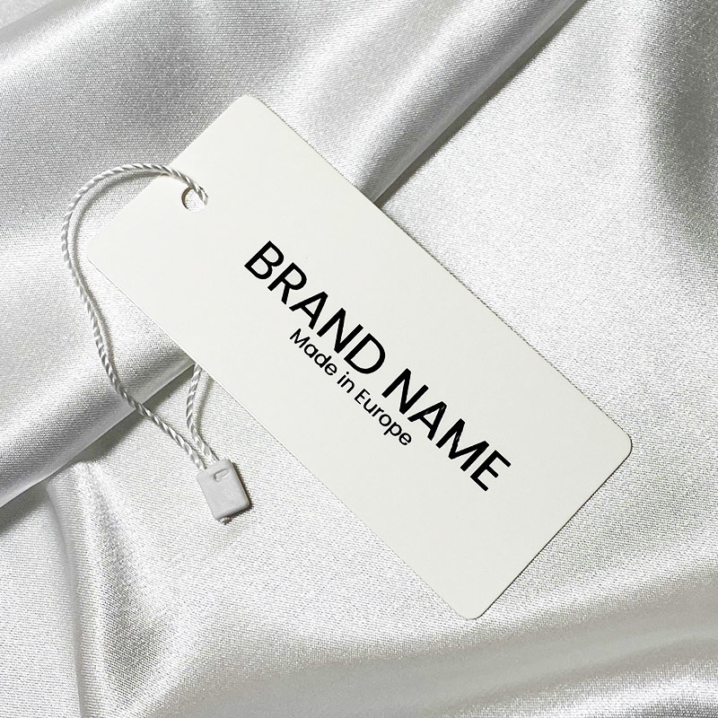 Aangepast label voor kleding, met wit koord, op bestelling gemaakt van dik karton, bedrukt met tekst of merklogo. Dit type hang tag wordt gemaakt van hoogwaardige materialen. Daarbij wordt gebruik gemaakt van de meest geavanceerde technologieën op het gebied van digitaal printen en afwerken.