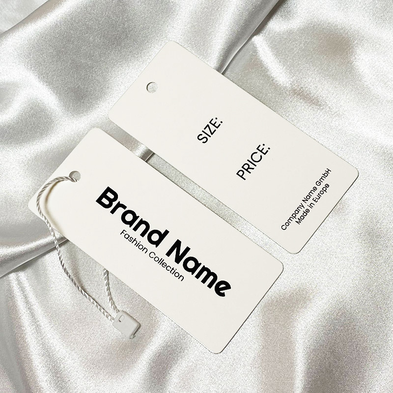 Kartonnen label met trekkoord om kleding of diverse kledingaccessoires op te hangen, gepersonaliseerd met de merknaam of logo, maar ook andere productinformatie, dubbelzijdig bedrukt. Dit type hang tag wordt gemaakt van hoogwaardige materialen. Daarbij wordt gebruik gemaakt van de meest geavanceerde technologieën op het gebied van digitaal printen en afwerken.