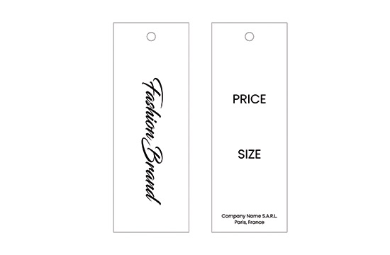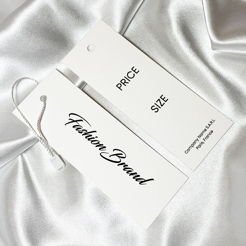 Productlabel gemaakt van karton, voorzien van een wit koord om aan kleding te hangen, gepersonaliseerd met tekst en het logo van de fabrikant aan beide zijden. Dit type hang tag wordt gemaakt van hoogwaardige materialen. Daarbij wordt gebruik gemaakt van de meest geavanceerde technologieën op het gebied van digitaal printen en afwerken.