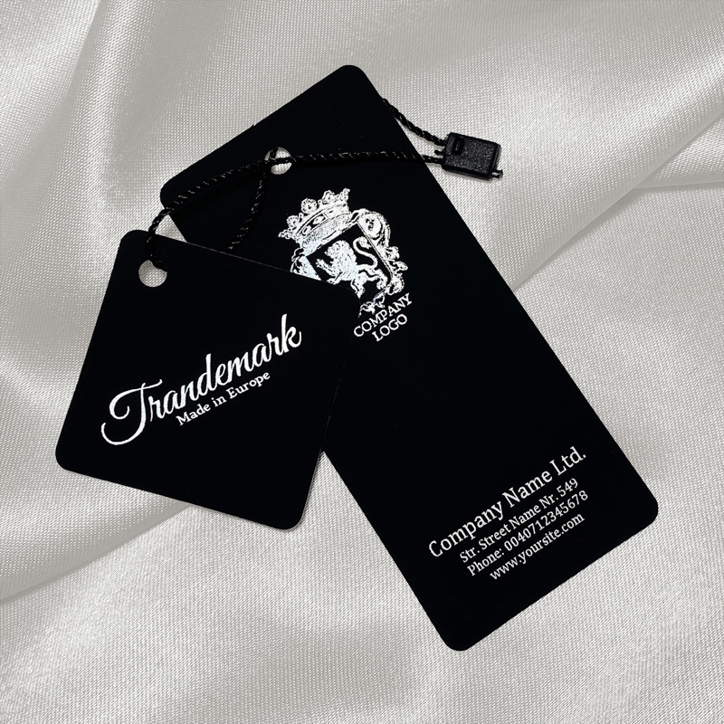 Set bestaande uit 2 prachtige kartonnen labels, inclusief sluiting met koordje voor kleding. De hang tags zijn gemaakt van zwart Soft Touch gelamineerd karton en gepersonaliseerd met zilveren folio Digital Hot Stamp type. Dit type hang tag wordt gemaakt van hoogwaardige materialen. Daarbij wordt gebruik gemaakt van de meest geavanceerde technologieën op het gebied van digitaal printen en afwerken.