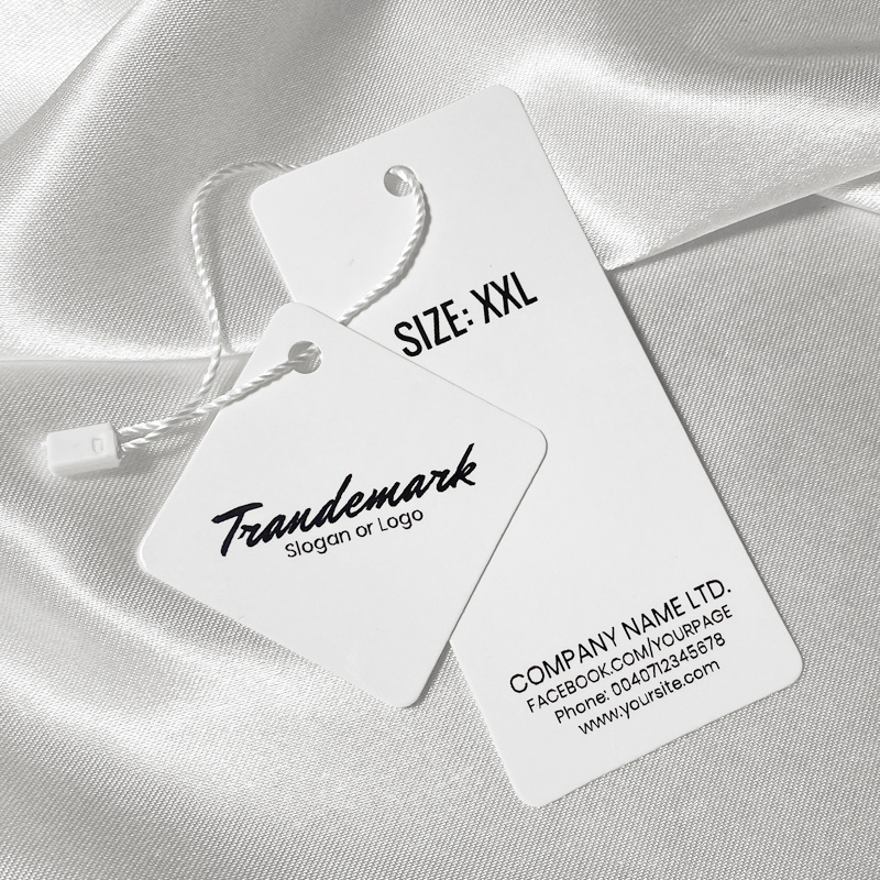 Kartonnen labels voor kleding met een wit zegel. Gemaakt van dik, gelamineerd karton met glanzende folie en een gepersonaliseerde tekst of merklogo. Dit type hang tag wordt gemaakt van hoogwaardige materialen. Daarbij wordt gebruik gemaakt van de meest geavanceerde technologieën op het gebied van digitaal printen en afwerken.