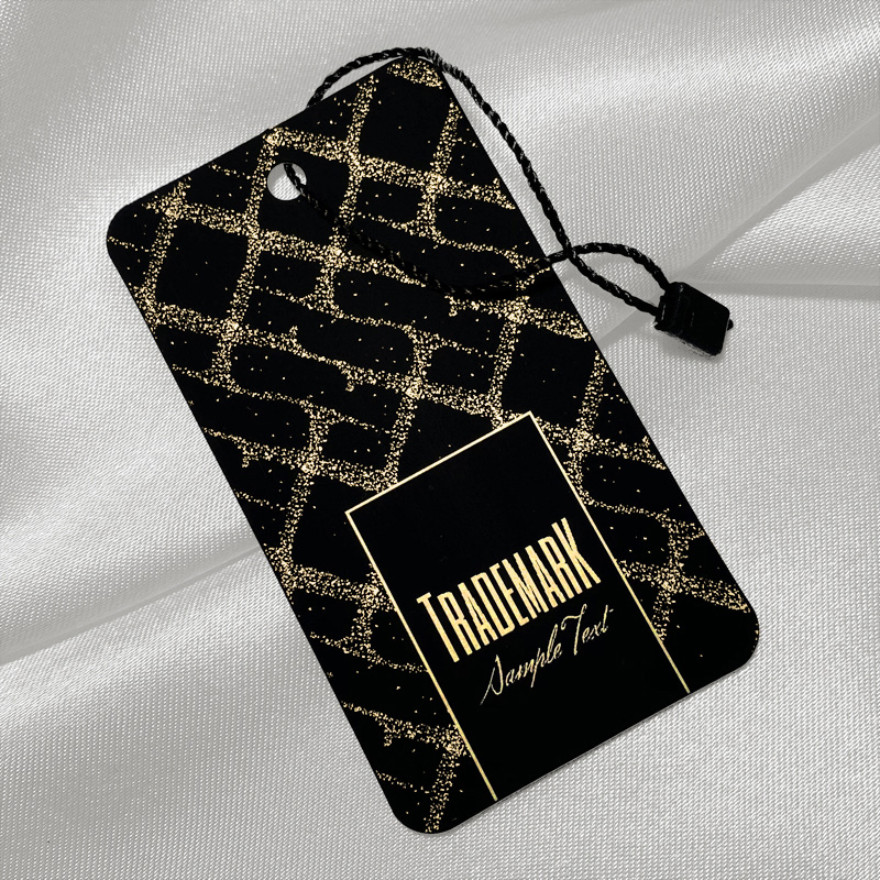 Gouden label gemaakt met gelamineerd karton en speciale folie met een fluwelen structuur. Geschikt voor kleding, kledingaccessoires, schoenen en andere soortgelijke producten. Dit type hang tag wordt gemaakt van hoogwaardige materialen. Daarbij wordt gebruik gemaakt van de meest geavanceerde technologieën op het gebied van digitaal printen en afwerken.