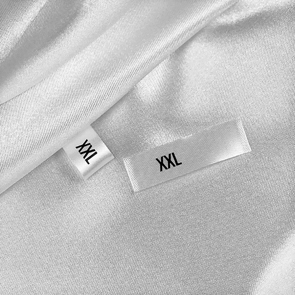 Maatlabel om in gevouwen vorm op een kledingstuk te naaien, gemaakt van fijn wit textielmateriaal. Dit type textiel label wordt gemaakt met behulp van de meest geavanceerde technologieën op het gebied van digitaal printen. De labels worden gedrukt op een speciaal satijn door middel van thermische overdracht. Dit resulteert in een indrukwekkende printkwaliteit en hoge wasbestendigheid.
