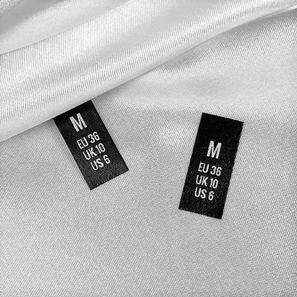 Maatlabels met maten, voor het opnaaien van kleding of voor op diverse kledingstukken, op bestelling gemaakt van hoogwaardig textiel. Dit type textiel label wordt gemaakt met behulp van de meest geavanceerde technologieën op het gebied van digitaal printen. De labels worden gedrukt op een speciaal satijn door middel van thermische overdracht. Dit resulteert in een indrukwekkende printkwaliteit en hoge wasbestendigheid.