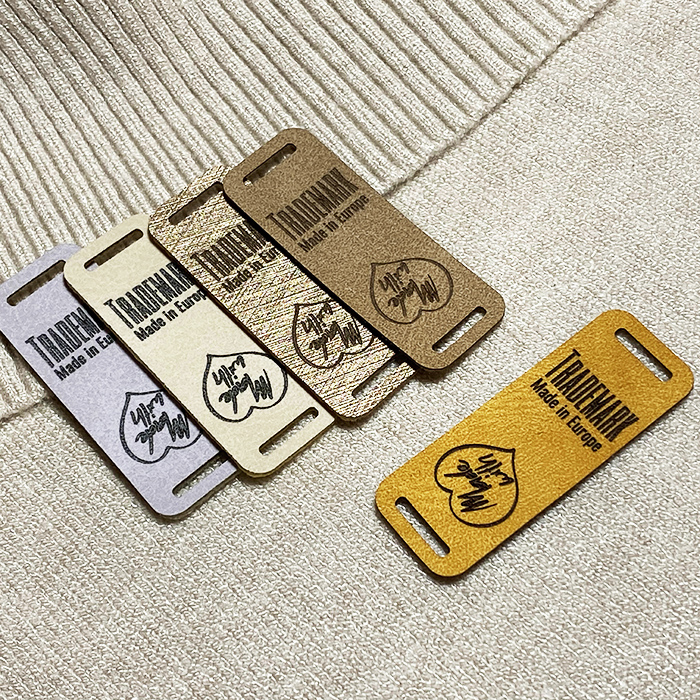 Gepersonaliseerd label EP-M165 van kunstleer voor kleding, tassen, schoenen en diverse kledingaccessoires.
