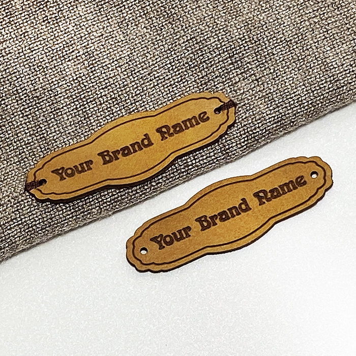 Natuurlijk lederen label aangepast met merknaam en logo model EP-M15, voor het naaien op kleding, tassen, truien, sjaals, hoeden en andere producten. Dit model lederen label is gemaakt van hoogwaardig natuurlijk leder, met behulp van de nieuwste generatie apparatuur en professionele lasergraveer- of reliëfmethoden.