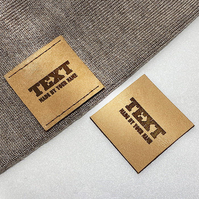 Gepersonaliseerd label EP-M45 van natuurlijk leer voor kleding, tassen, schoenen en diverse kledingaccessoires.
