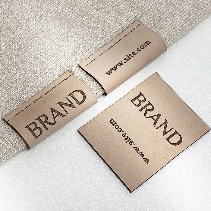Merklabel van natuurlijk leer model EP-M47, geschikt om op kleding, tassen, schoenen, diverse kledingaccessoires te naaien, gepersonaliseerd door lasergravure met de merknaam. Dit model lederen label is gemaakt van hoogwaardig natuurlijk leder, met behulp van de nieuwste generatie apparatuur en professionele lasergraveer- of reliëfmethoden.