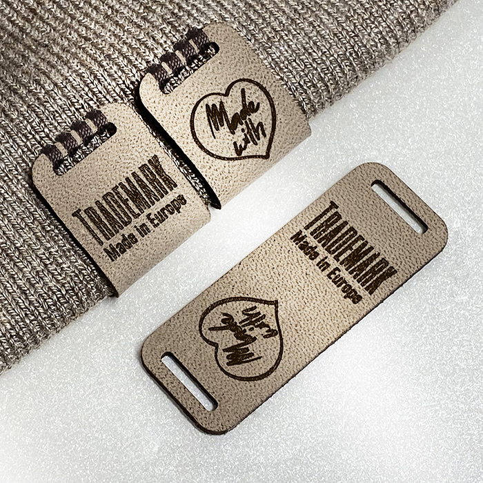 Gepersonaliseerd label EP-M65 van natuurlijk leer voor kleding, tassen, schoenen en diverse kledingaccessoires.