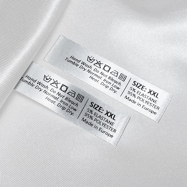 Gepersonaliseerd satijnen label voor het labelen van kleding met informatie over verzorging en onderhoud, inclusief wassymbolen, samenstelling en maten. Dit type textiel label wordt gemaakt met behulp van de meest geavanceerde technologieën op het gebied van digitaal printen. De labels worden gedrukt op een speciaal satijn door middel van thermische overdracht. Dit resulteert in een indrukwekkende printkwaliteit en hoge wasbestendigheid.
