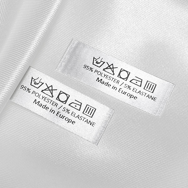 Het textiellabel met was- en onderhoudssymbolen voor het opnaaien van kleding, gepersonaliseerd met de gegevens over de samenstelling van het materiaal en het land van vervaardiging. Dit type textiel label wordt gemaakt met behulp van de meest geavanceerde technologieën op het gebied van digitaal printen. De labels worden gedrukt op een speciaal satijn door middel van thermische overdracht. Dit resulteert in een indrukwekkende printkwaliteit en hoge wasbestendigheid.