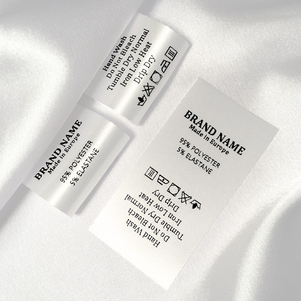 Wasverzorgingslabel, gedrukt op wit satijn met een fijne textuur en gepersonaliseerd met zwarte tekst. Dit type textiel label wordt gemaakt met behulp van de meest geavanceerde technologieën op het gebied van digitaal printen. De labels worden gedrukt op een speciaal satijn door middel van thermische overdracht. Dit resulteert in een indrukwekkende printkwaliteit en hoge wasbestendigheid.