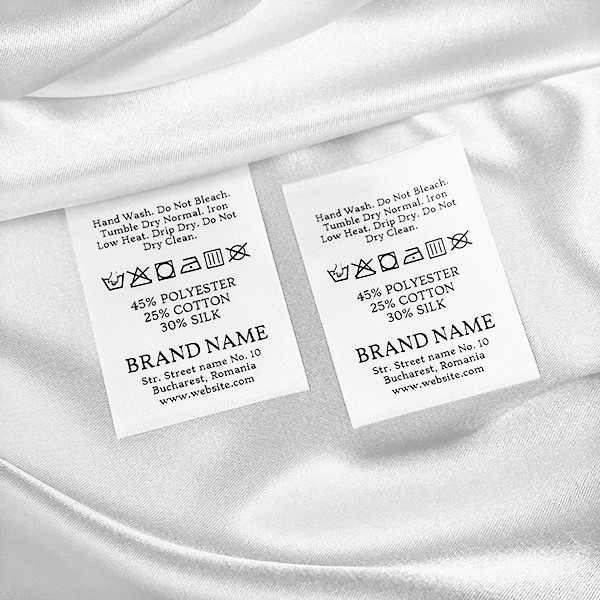 Waslabel gemaakt van fijn wit satijn, gepersonaliseerd met de naam en het logo van de fabrikant, wassymbolen en het soort materiaal dat wordt gebruikt om het item te maken waaraan wordt genaaid. Dit type textiel label wordt gemaakt met behulp van de meest geavanceerde technologieën op het gebied van digitaal printen. De labels worden gedrukt op een speciaal satijn door middel van thermische overdracht. Dit resulteert in een indrukwekkende printkwaliteit en hoge wasbestendigheid.
