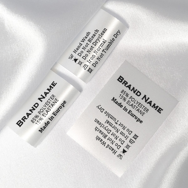Wasverzorgingslabel gepersonaliseerd met wassymbolen en wasinstructies. Geschikt voor diverse kledingstukken. Dit type textiel label wordt gemaakt met behulp van de meest geavanceerde technologieën op het gebied van digitaal printen. De labels worden gedrukt op een speciaal satijn door middel van thermische overdracht. Dit resulteert in een indrukwekkende printkwaliteit en hoge wasbestendigheid.